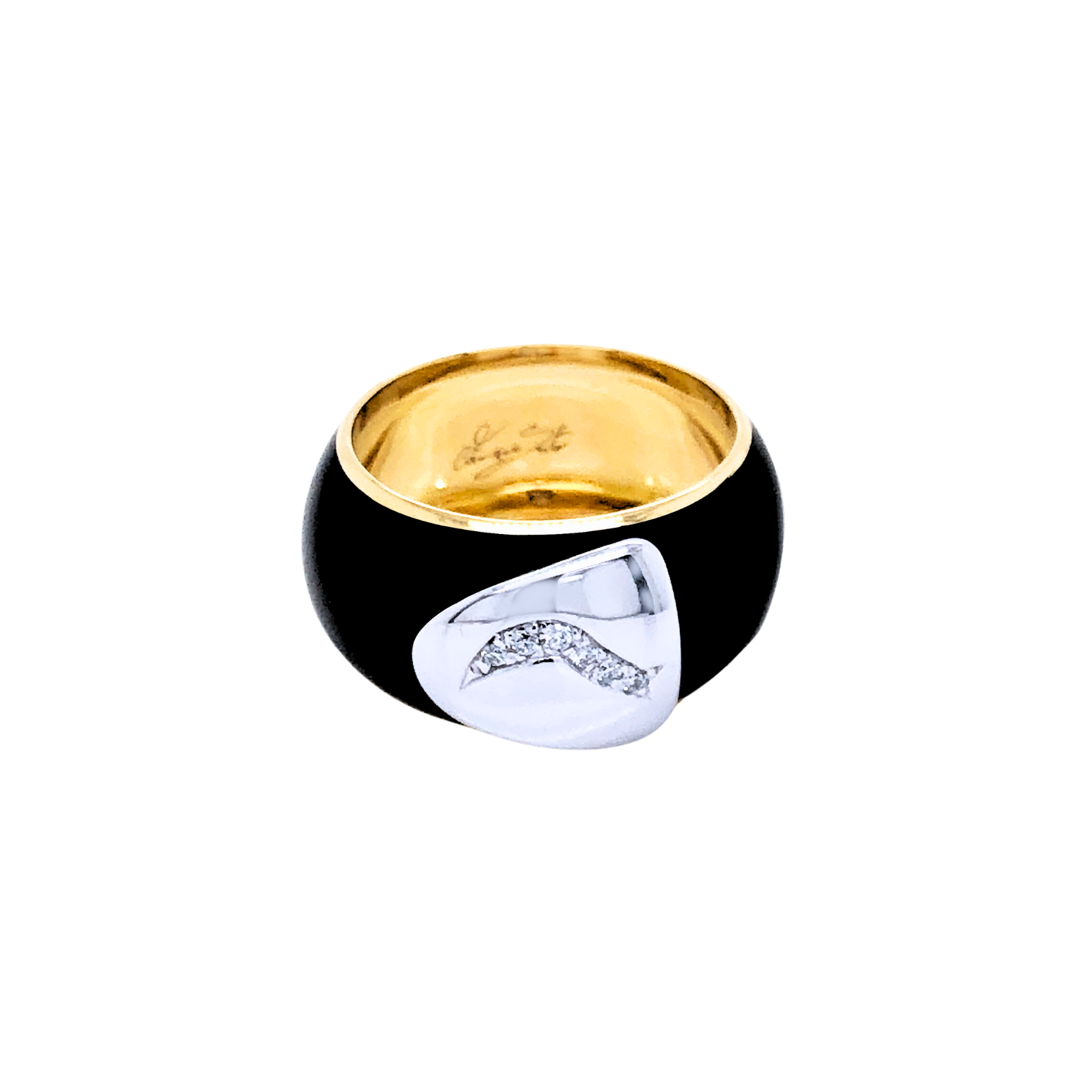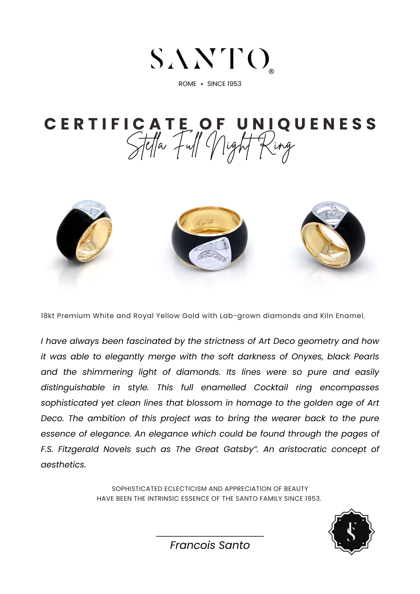This full enamelled Cocktail ring encompasses sophisticated yet clean lines that blossom in homage to the golden age of Art Deco. The ambition of this project was to bring the wearer back to the pure essence of elegance. An elegance that could be found in the pages of F.S. Fitzgerald Novels such as The Great Gatsby”.