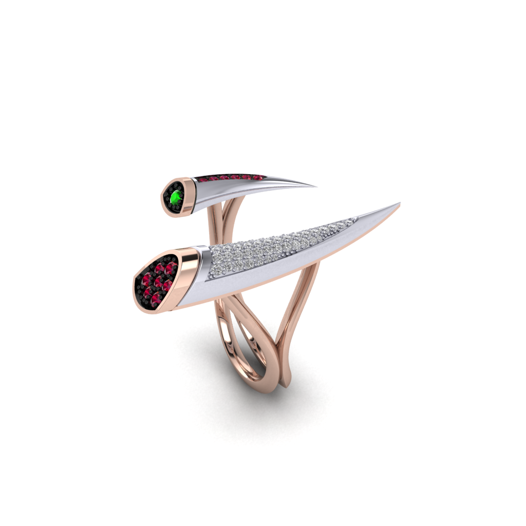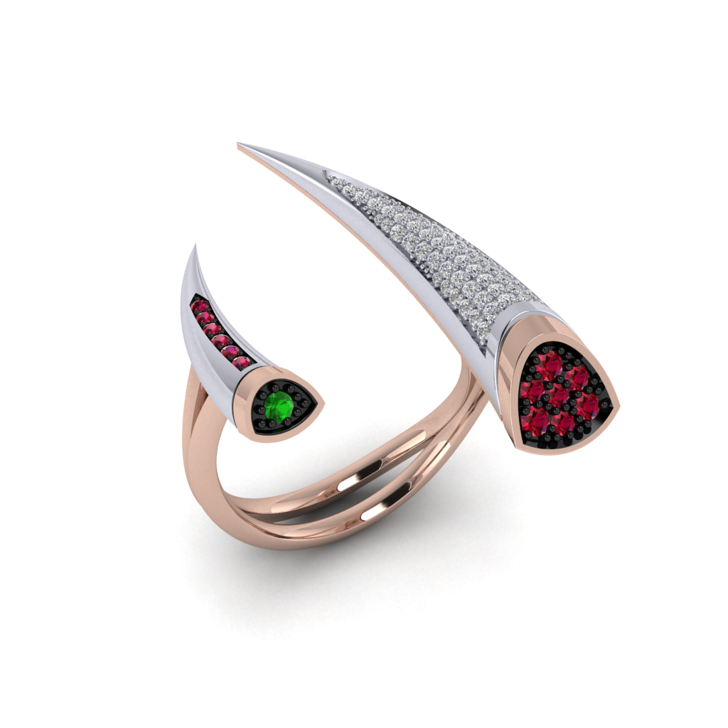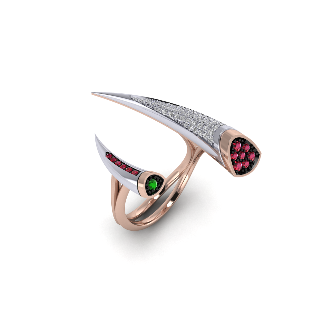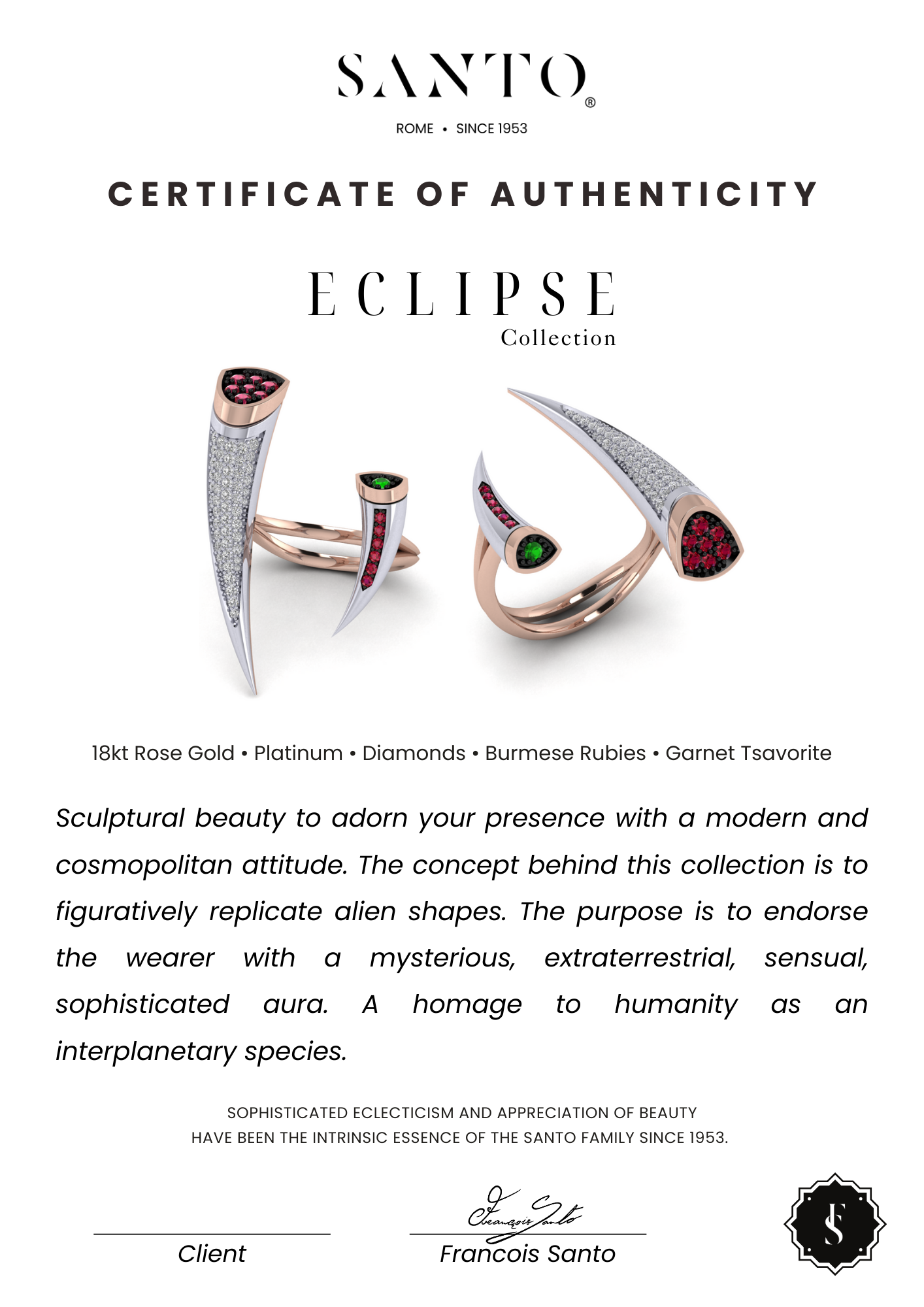 Eclipse Ring with White Diamonds, Burmese Rubies and Garnet Tsavorite