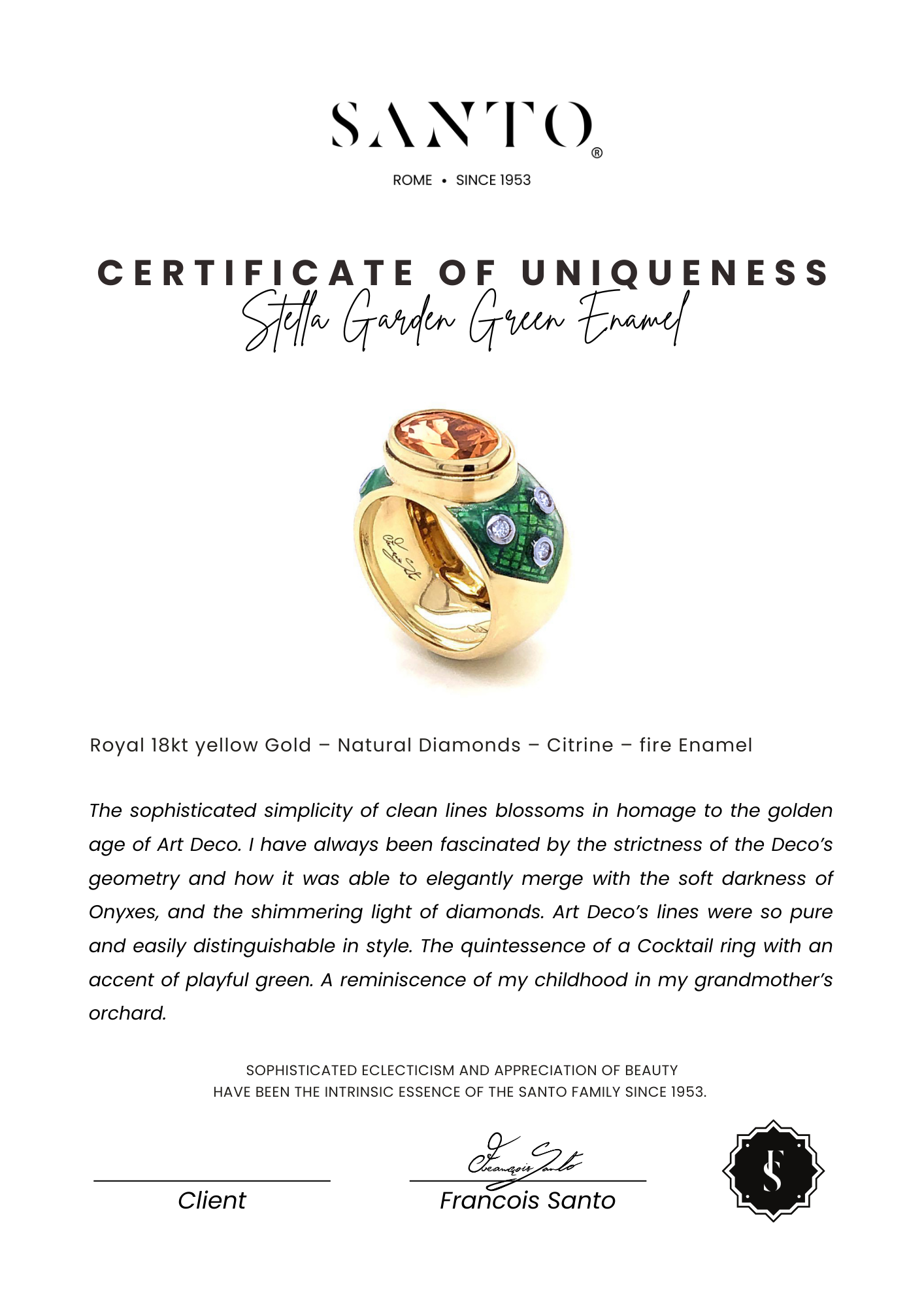 The sophisticated simplicity of clean lines blossoms in homage to the golden age of Art Deco. I have always been fascinated by the strictness of the Deco’s geometry and how it was able to elegantly merge with the soft darkness of Onyxes, as well as the shimmering light of diamonds. Art Deco’s lines were so pure and easily distinguishable in style. The quintessence of a Cocktail ring with an accent of playful green. A reminiscence of my childhood in my grandmother’s orchard.