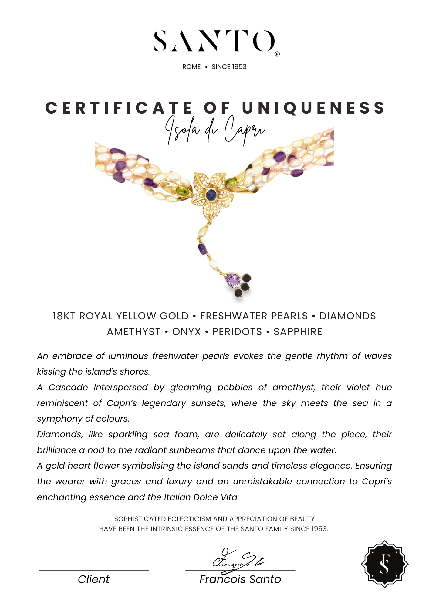 A Cascade Interspersed by gleaming pebbles of amethyst, their violet hue reminiscent of Capri’s legendary sunsets, where the sky meets the sea in a symphony of colours.