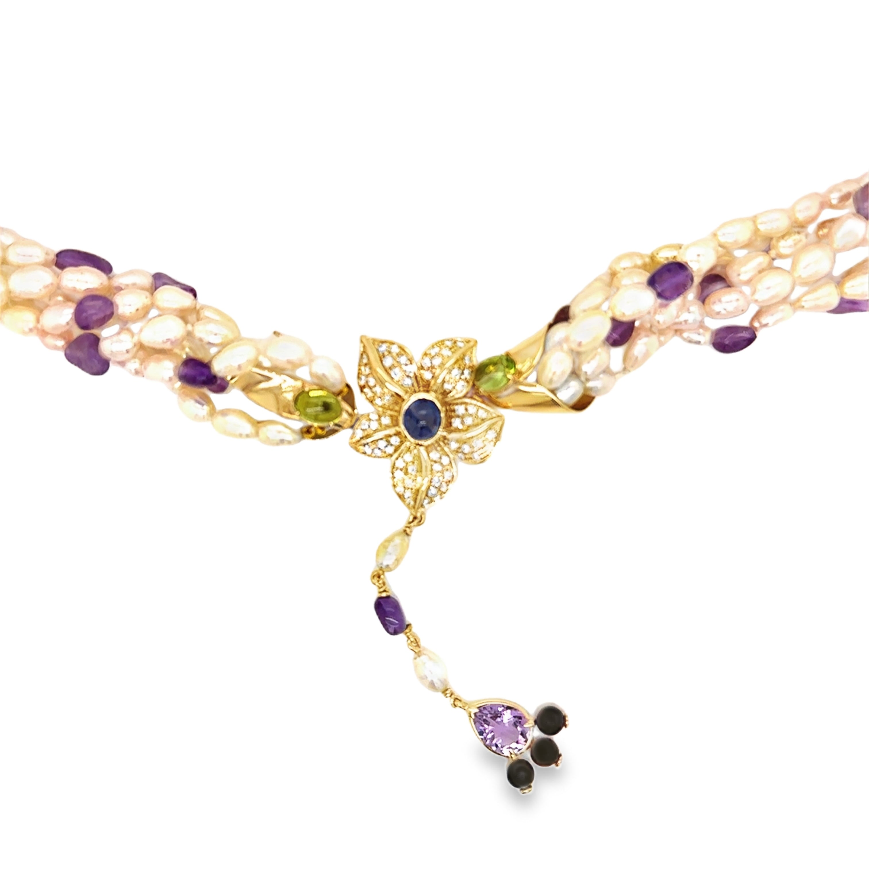 18kt Royal Yellow Gold, Freshwater Pearls, Amethyst, Sapphire, Peridot, Diamonds, Onyx
