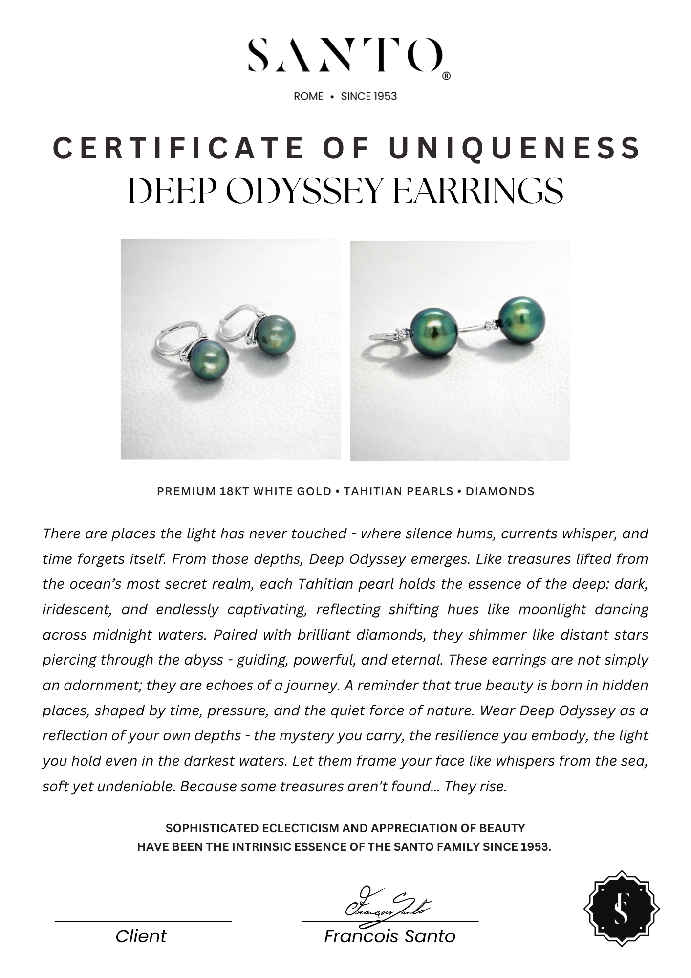 There are places the light has never touched - where silence hums, currents whisper, and time forgets itself. From those depths, Deep Odyssey emerges. Like treasures lifted from the ocean’s most secret realm, each Tahitian pearl holds the essence of the deep: dark, iridescent, and endlessly captivating, reflecting shifting hues like moonlight dancing across midnight waters. Paired with brilliant diamonds, they shimmer like distant stars piercing through the abyss - guiding, powerful, and eternal. These earrings are not simply an adornment; they are echoes of a journey. A reminder that true beauty is born in hidden places, shaped by time, pressure, and the quiet force of nature. Wear Deep Odyssey as a reflection of your own depths - the mystery you carry, the resilience you embody, the light you hold even in the darkest waters. Let them frame your face like whispers from the sea, soft yet undeniable. Because some treasures aren’t found… They rise.
