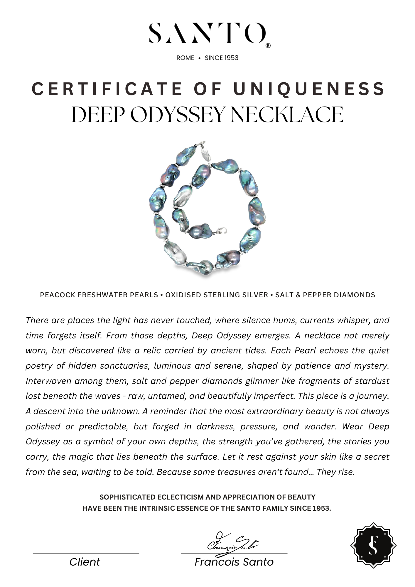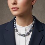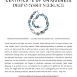There are places the light has never touched, where silence hums, currents whisper, and time forgets itself. From those depths, Deep Odyssey emerges. A necklace not merely worn, but discovered like a relic carried by ancient tides. Each Pearl echoes the quiet poetry of hidden sanctuaries, luminous and serene, shaped by patience and mystery. Interwoven among them, salt and pepper diamonds glimmer like fragments of stardust lost beneath the waves - raw, untamed, and beautifully imperfect. This piece is a journey. A descent into the unknown. A reminder that the most extraordinary beauty is not always polished or predictable, but forged in darkness, pressure, and wonder. Wear Deep Odyssey as a symbol of your own depths, the strength you’ve gathered, the stories you carry, the magic that lies beneath the surface. Let it rest against your skin like a secret from the sea, waiting to be told. Because some treasures aren’t found… They rise.
