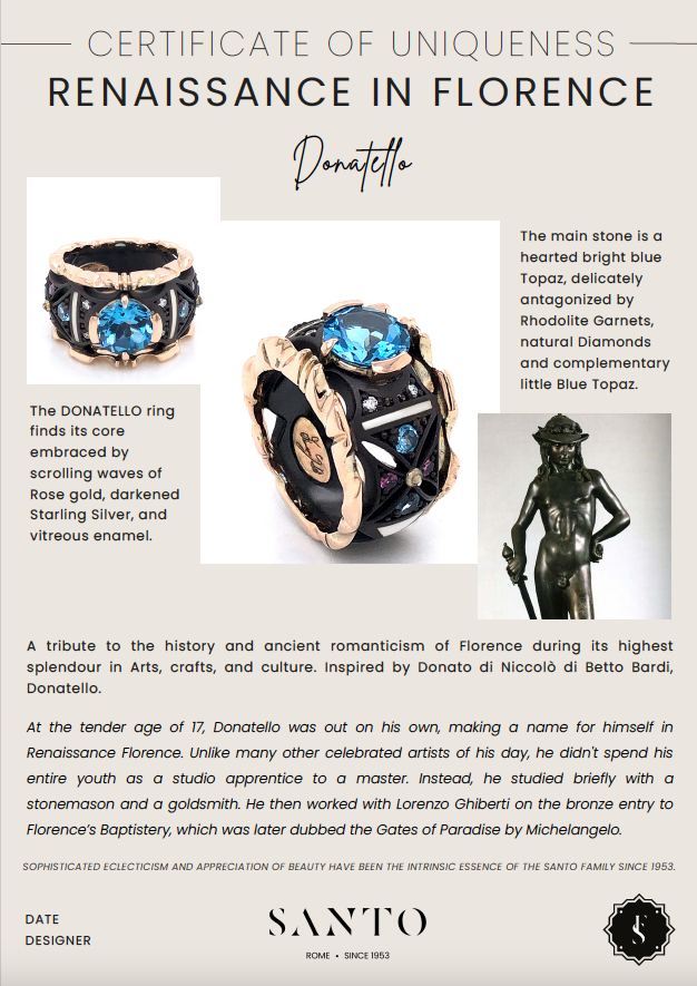 A tribute to the history and ancient romanticism of Florence during its highest splendour in Arts, crafts, and culture. Inspired by Donato di Niccolò di Betto Bardi, Donatello.
