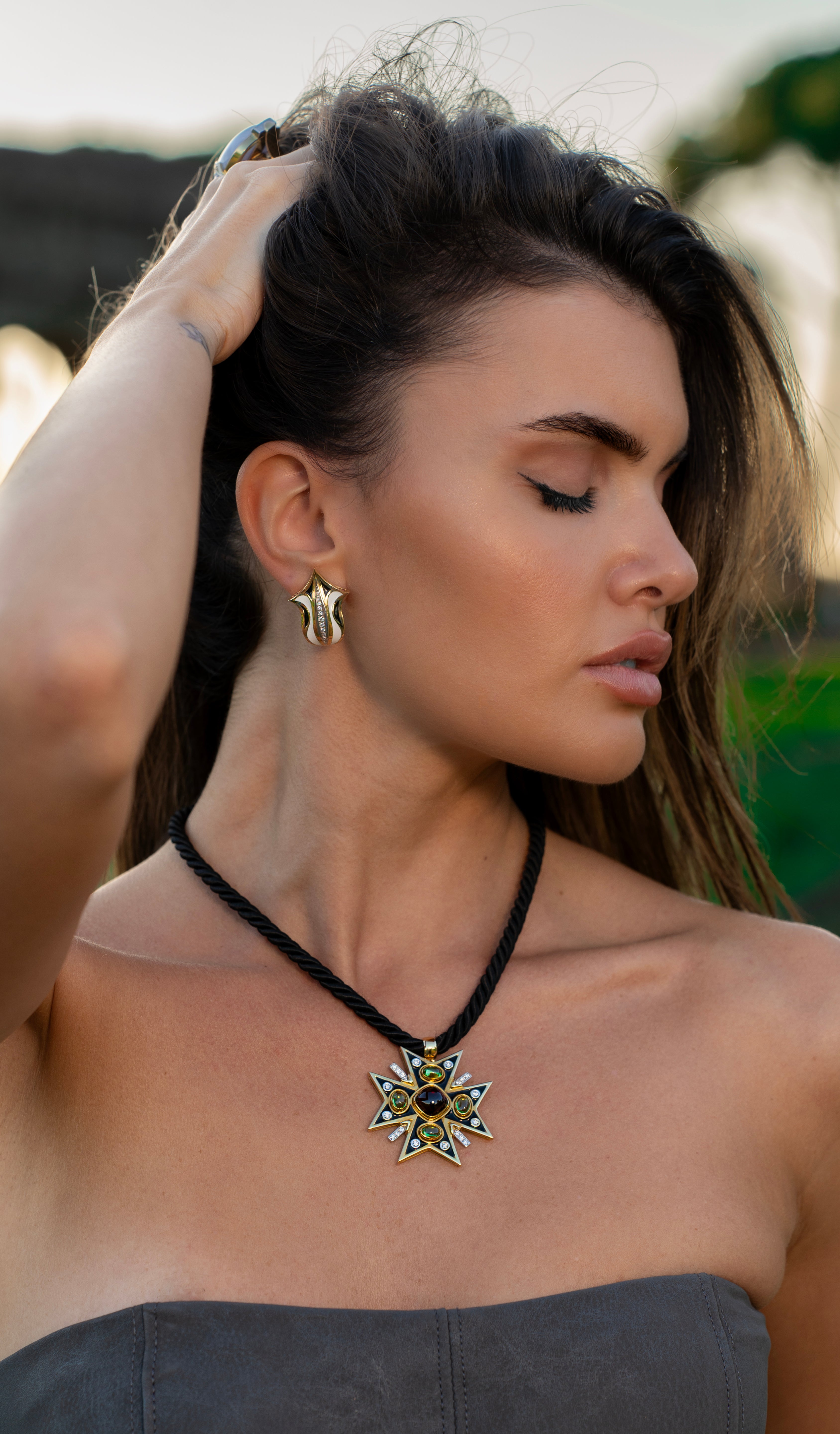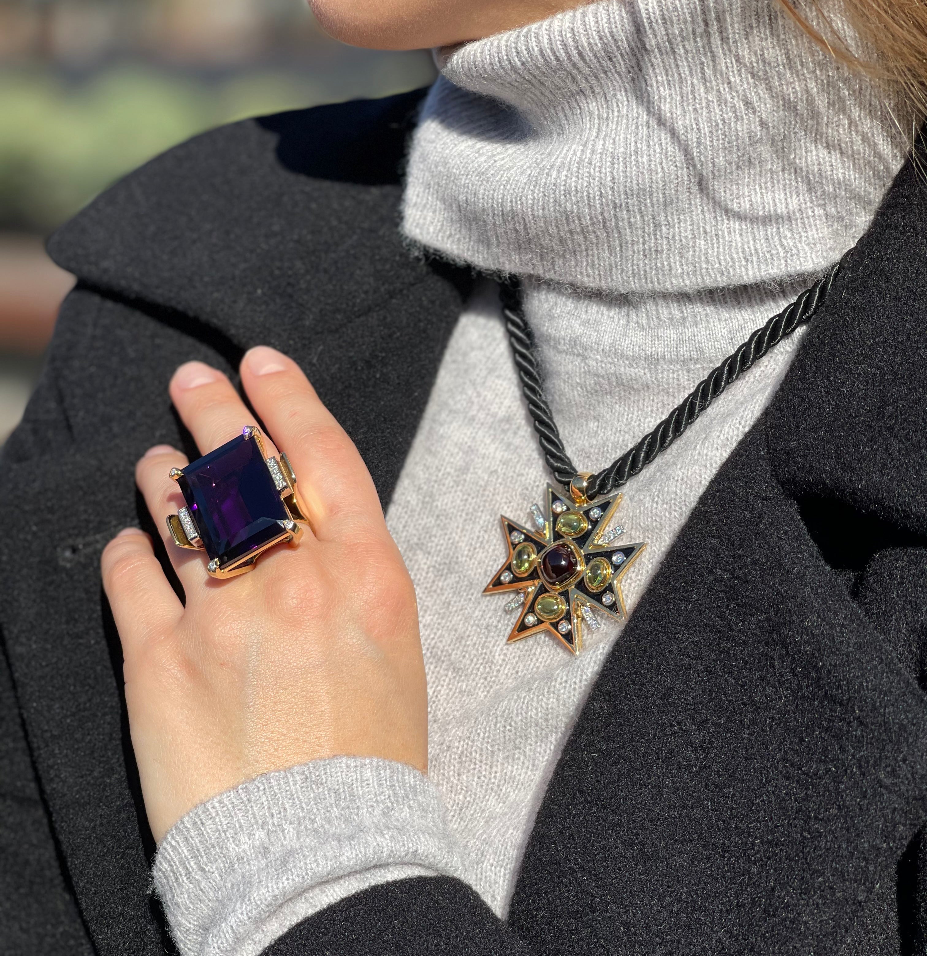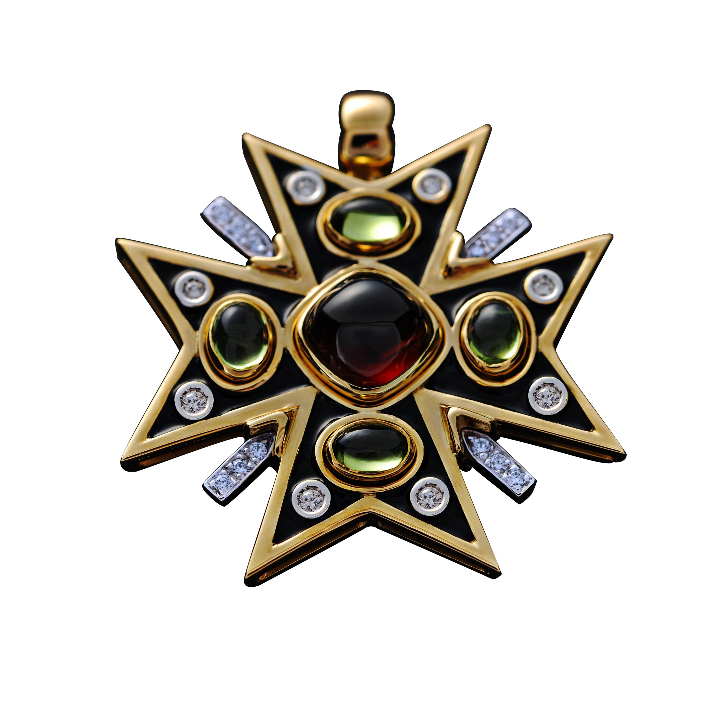 Premium Royal Yellow and White 18ct Gold, Diamonds, Cabochon Garnets and Peridots, Black Fire Enamel.