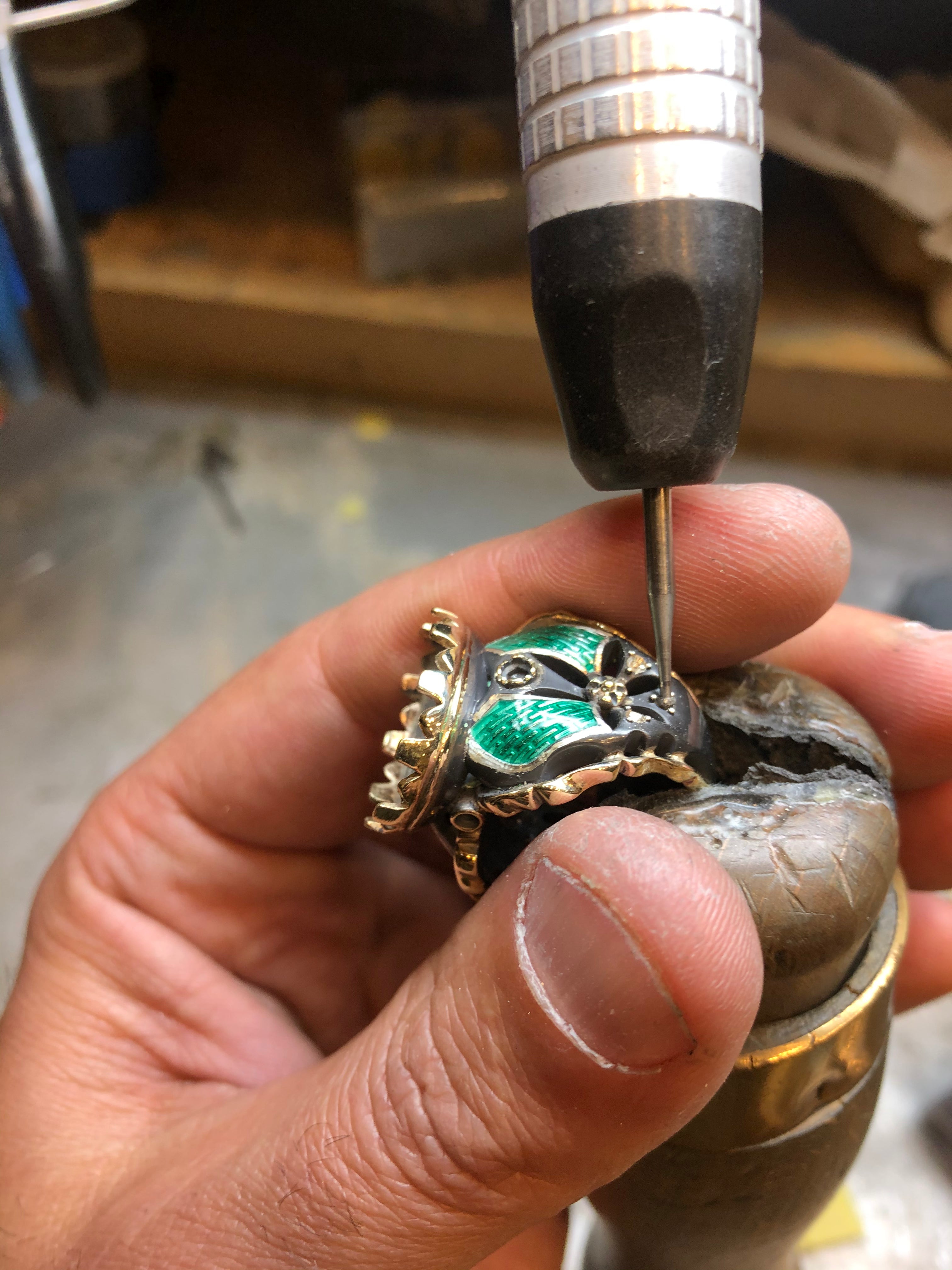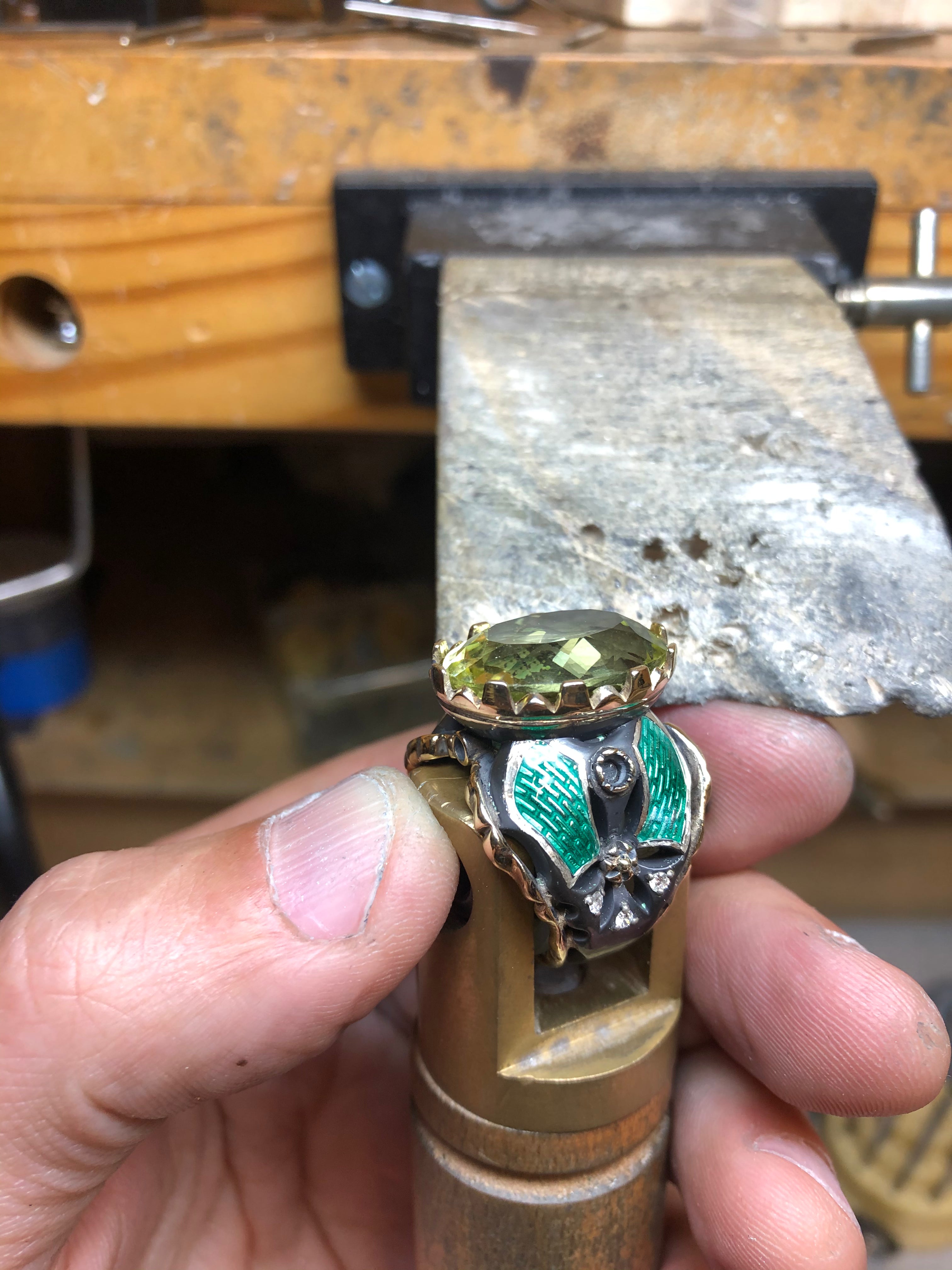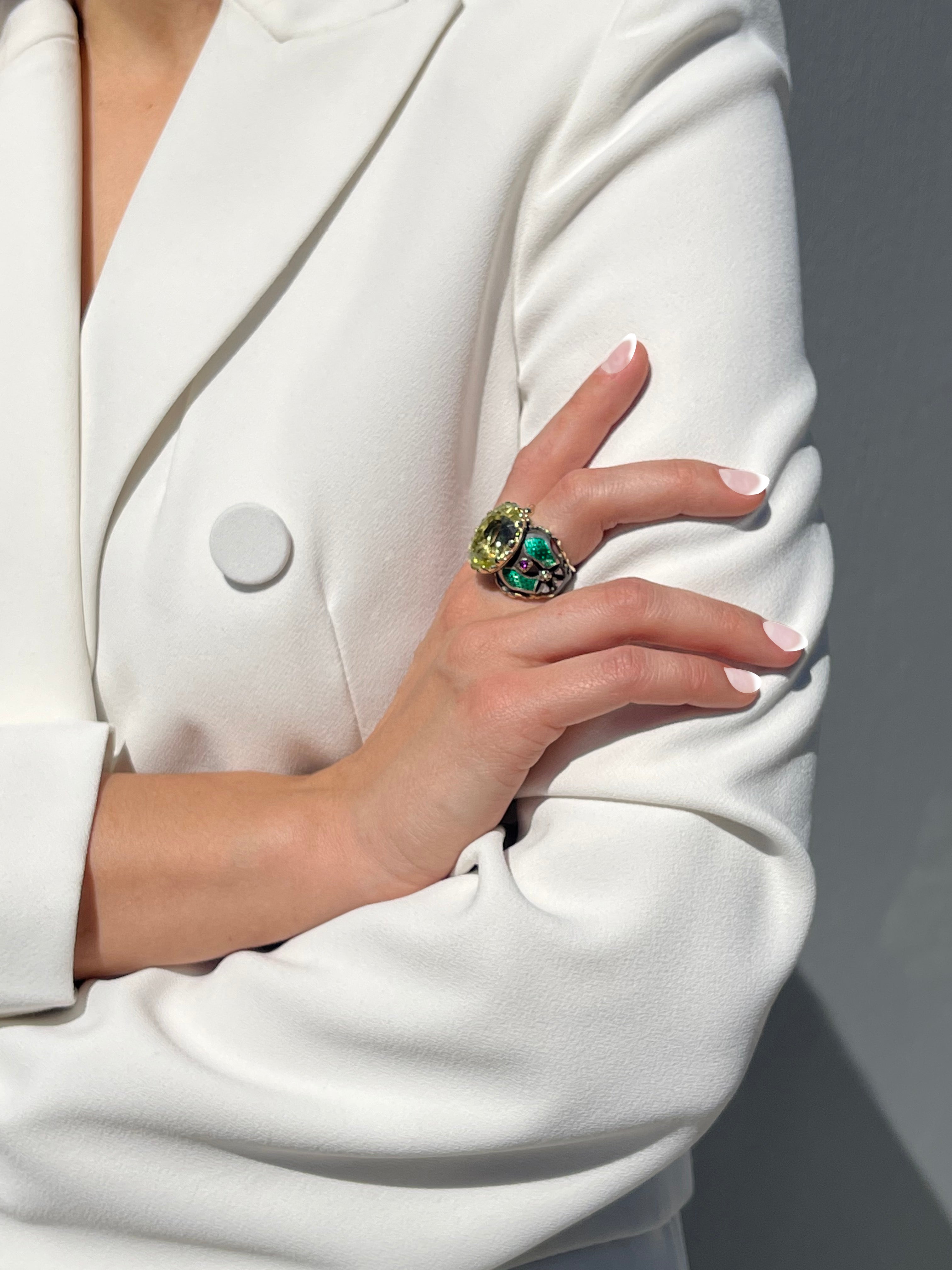9kt Yellow Gold, Black Sterling Silver, Vitreous Enamel, Lemon Topaz, Diamonds, Rhodolite Garnets and Colombian Emeralds