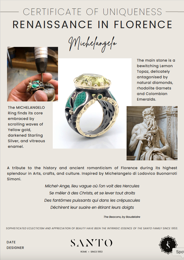 A tribute to the history and ancient romanticism of Florence during its highest splendour in Arts, crafts, and culture. Inspired by Michelangelo di Lodovico Buonarroti Simoni.