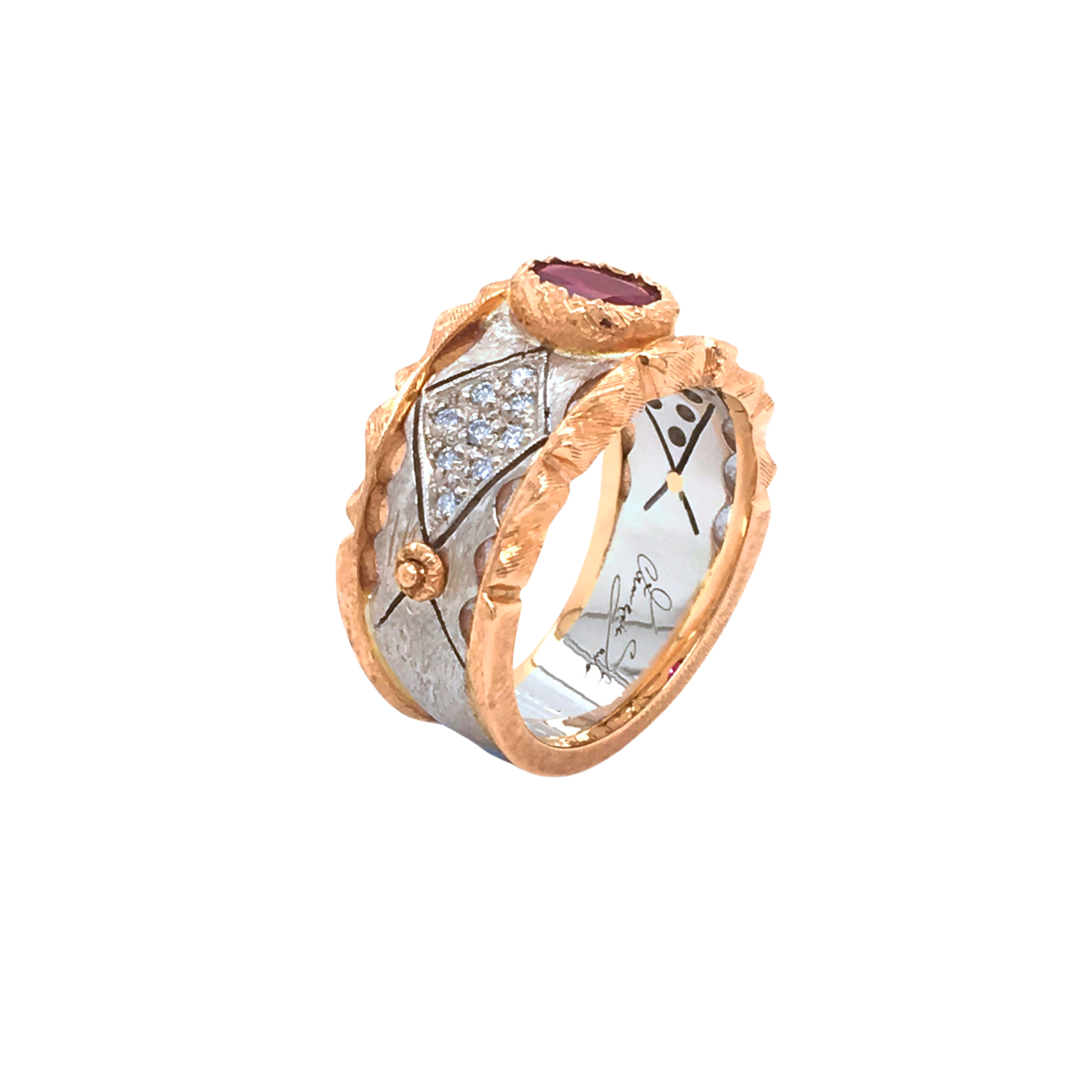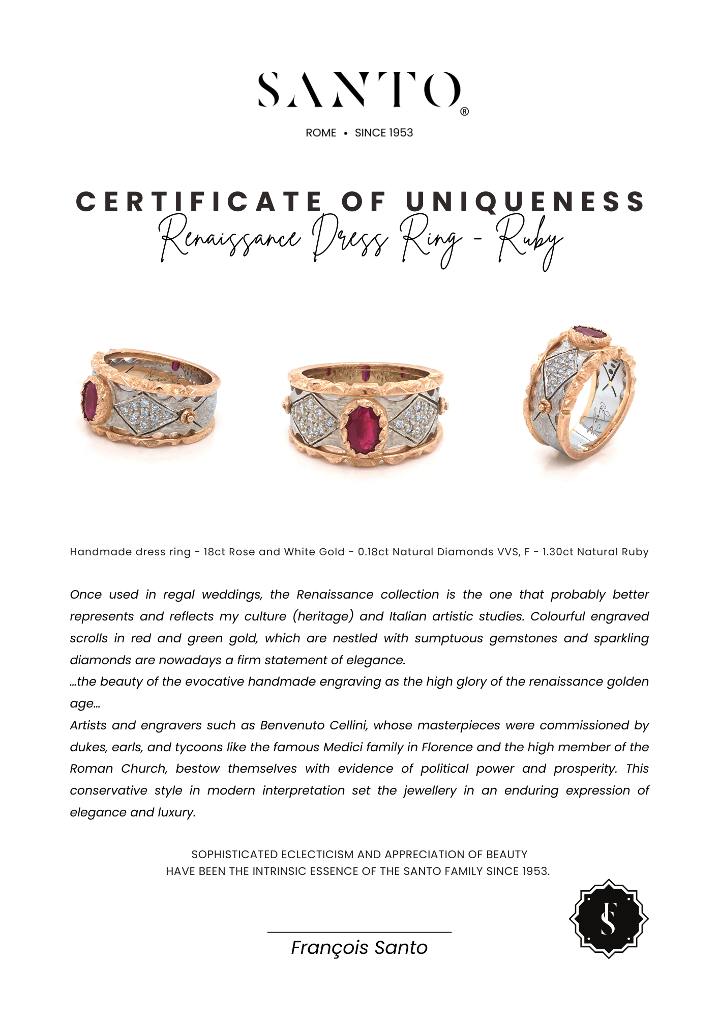 Once used in regal weddings, the Renaissance collection is the one that better represents and reflects my cultural heritage and Italian artistic studies. Colourful engraved scrolls in red and green gold, nestled with sumptuous gemstones and sparkling diamonds, are nowadays a firm statement of elegance.